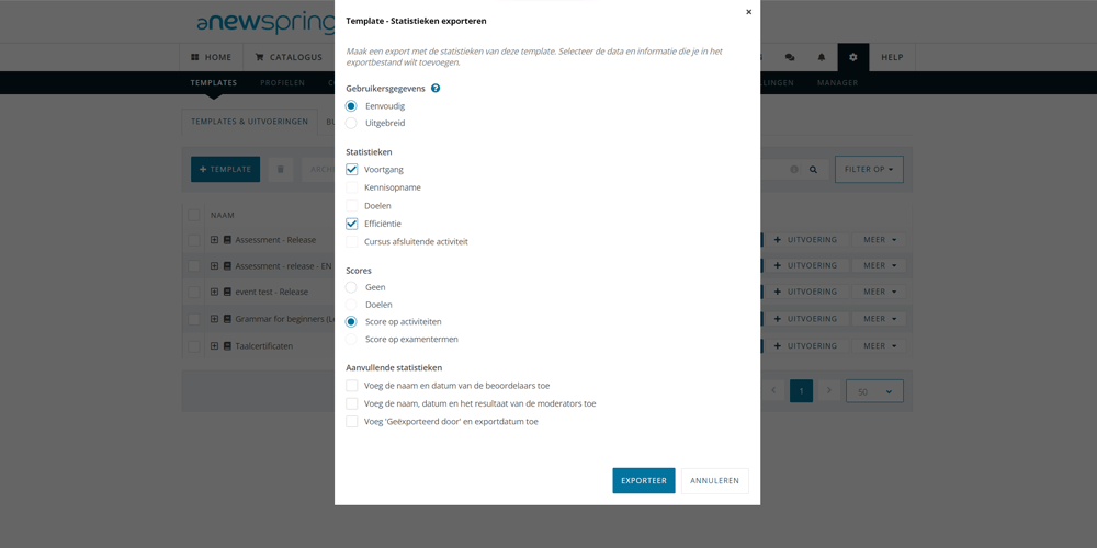 Het is vanaf deze release ook mogelijk om voortgang en statistieken te kunnen exporteren. Zo kan een derde partij zien hoeveel een deelnemer heeft gescoord op een activiteit, wie het heeft beoordeeld, wie de beoordeling heeft gemodereerd en op welke datum de activiteiten zijn voltooid.